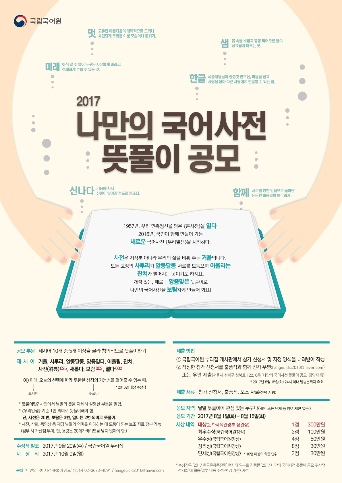 문의처 ‘나만의 국어사전 뜻풀이 공모’ 담당자 02-3673-4594 / hangeuldic2016@naver.com