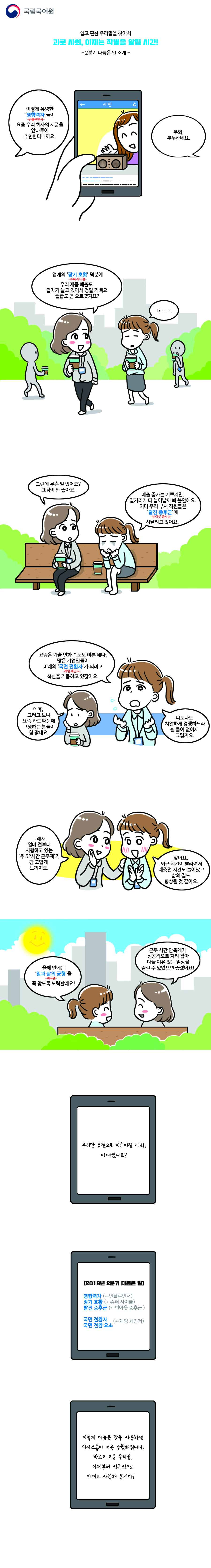 국립국어원은 지난 2018년 4월 17일부터 2018년 5월 20일까지 ‘게임 체인저’, ‘번아웃 증후군’, ‘슈퍼 사이클’, ‘인플루언서’를 갈음할 우리말을 공모했다.